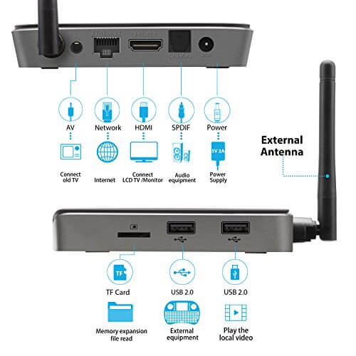 The CPU is Amlogic S905X Quad core ARM Cortex-A53 up to 2 GHz with Mali-450 penta-core GPU up to 750MHz+(DVFS), support VP9-10/h.265 up to 4Kx2K@60fps, h.264 up to 1080p@60fps, which is way ahead in image processing and computing. Its high machine configuration gives you ultra-fast running speed and professional image processing ability. With the built-in HDMI 2.0a & HDR processing, make sure you can enjoy 4Kx2K movies.